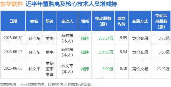 消息,根據(jù)7月1日市場公開信息、上市公司公告及交易所披露數(shù)據(jù)整理,東華軟件(002065)最新董監(jiān)高及相關(guān)人員股份變動(dòng)情況:2025年6月30日公司董事薛向東共減持公司股份503.54萬股,占公司總股本為0.1571%。變動(dòng)期間公司股價(jià)下跌1.44%,6月30日當(dāng)日收盤報(bào)9.6元。
