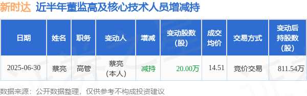 摘要: 消息,根據(jù)7月1日市場公開信息、上市公司公告及交易所披露數(shù)據(jù)整理,新時達(002527)最新董監(jiān)高及相關(guān)人員股份變動情況:2025年6月30日公司高管蔡亮共減持公司股份20.0萬股,