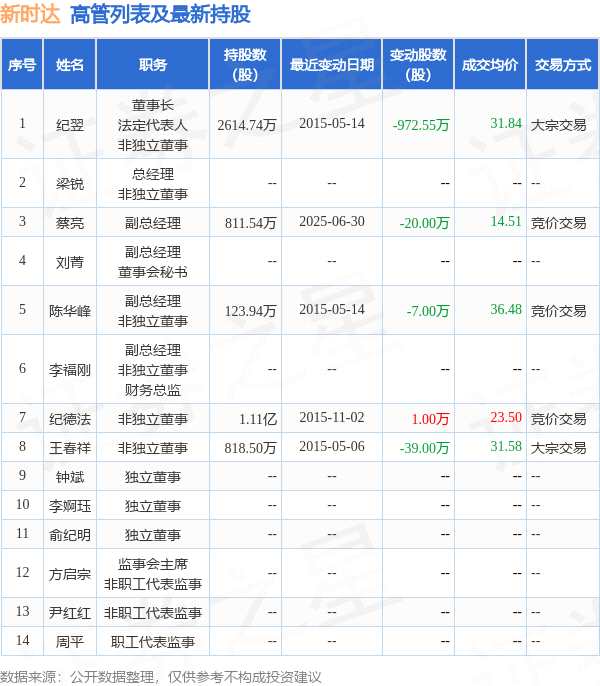 新時達的高管列表及最新持股情況如下: