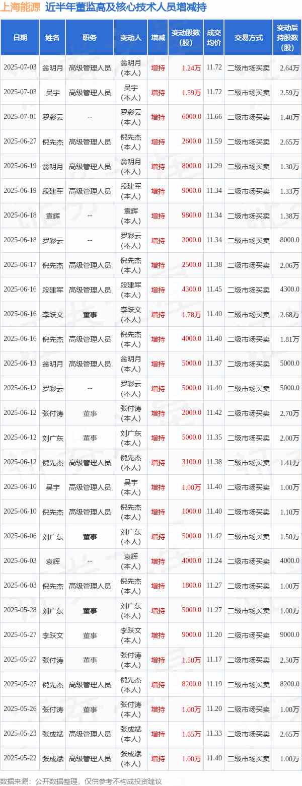 上海能源近半年內(nèi)的董監(jiān)高及核心技術(shù)人員增減持詳情如下: