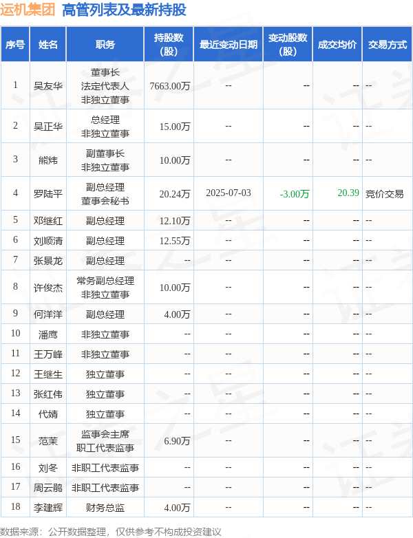 摘要: 消息,根據(jù)7月4日市場公開信息、上市公司公告及交易所披露數(shù)據(jù)整理,運機集團(001288)最新董監(jiān)高及相關人員股份變動情況:2025年7月3日公司董秘,高管羅陸平共減持公司股份3.0萬股,