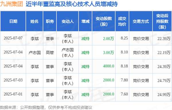 摘要: 消息,根據(jù)7月8日市場公開信息、上市公司公告及交易所披露數(shù)據(jù)整理,九洲集團(300040)最新董監(jiān)高及相關(guān)人員股份變動情況:2025年7月7日公司董事李斌共減持公司股份2.0萬股,