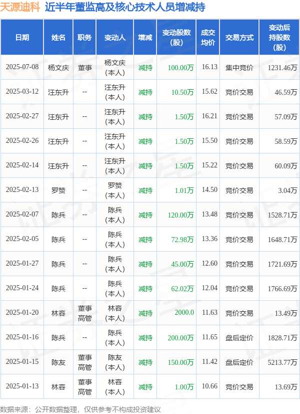 摘要: 消息,根據(jù)7月9日市場公開信息、上市公司公告及交易所披露數(shù)據(jù)整理,天源迪科(300047)最新董監(jiān)高及相關(guān)人員股份變動情況:2025年7月8日公司董事楊文慶共減持公司股份100.0萬股,