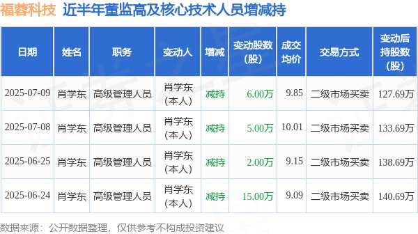 摘要: 消息,根據(jù)7月10日市場(chǎng)公開(kāi)信息、上市公司公告及交易所披露數(shù)據(jù)整理,福蓉科技(603327)最新董監(jiān)高及相關(guān)人員股份變動(dòng)情況:2025年7月9日公司高級(jí)管理人員肖學(xué)東共減持公司股份6.0萬(wàn)股,