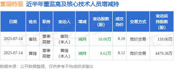摘要: 消息,根據(jù)7月15日市場(chǎng)公開(kāi)信息、上市公司公告及交易所披露數(shù)據(jù)整理,富瑞特裝(300228)最新董監(jiān)高及相關(guān)人員股份變動(dòng)情況:2025年7月14日公司董事,高管黃鋒、董事,高管姜琰共減持公司股份18.
