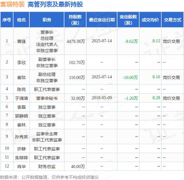 富瑞特裝的高管列表及最新持股情況如下: