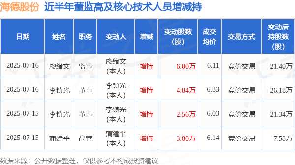 消息,根據(jù)7月17日市場公開信息、上市公司公告及交易所披露數(shù)據(jù)整理,海德股份(000567)最新董監(jiān)高及相關(guān)人員股份變動情況:2025年7月16日公司董事李鎮(zhèn)光、監(jiān)事廖緒文共增持公司股份10.84萬股,占公司總股本為0.0056%。變動期間公司股價上漲5.79%,7月16日當日收盤報6.4元。