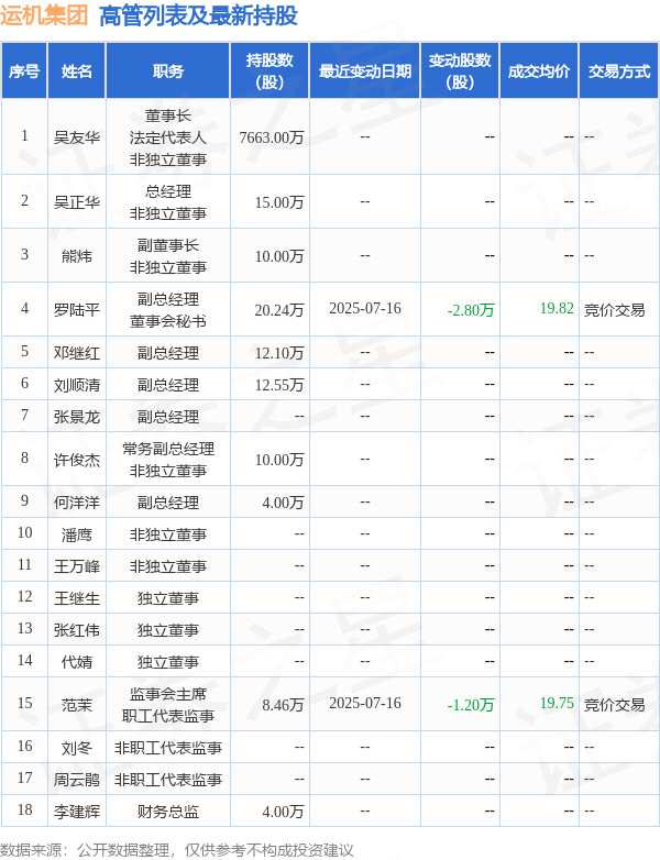 運(yùn)機(jī)集團(tuán)的高管列表及最新持股情況如下: