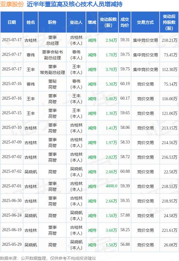 摘要: 消息,根據7月17日市場公開信息、上市公司公告及交易所披露數據整理,亞康股份(301085)最新董監(jiān)高及相關人員股份變動情況:2025年7月17日公司董事,總經理古桂林、董事,常務副總經理王豐、董事會