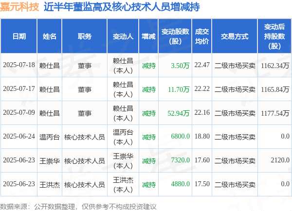 摘要: 消息,根據(jù)7月21日市場(chǎng)公開信息、上市公司公告及交易所披露數(shù)據(jù)整理,嘉元科技(688388)最新董監(jiān)高及相關(guān)人員股份變動(dòng)情況:2025年7月18日公司董事賴仕昌共減持公司股份3.5萬股,