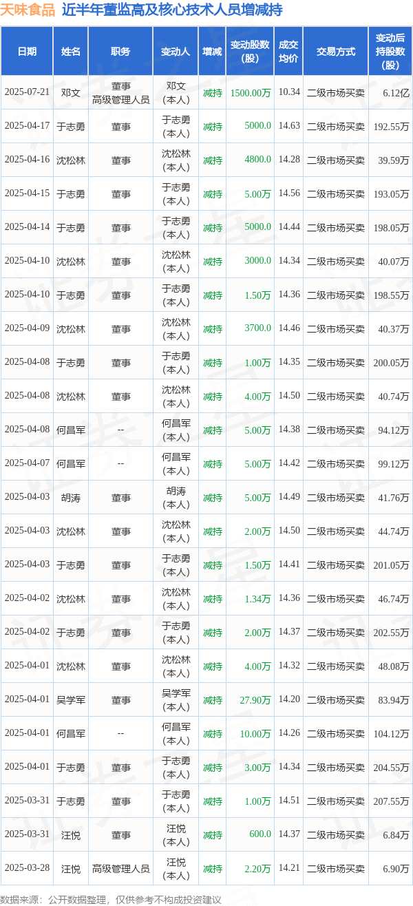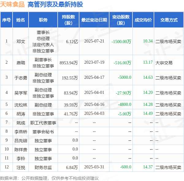 消息,根據(jù)7月22日市場公開信息、上市公司公告及交易所披露數(shù)據(jù)整理,天味食品(603317)最新董監(jiān)高及相關(guān)人員股份變動情況:2025年7月21日公司董事,高級管理人員鄧文共減持公司股份1500.0萬股,占公司總股本為1.4085%。變動期間公司股價(jià)上漲0.0%,7月21日當(dāng)日收盤報(bào)11.49元。