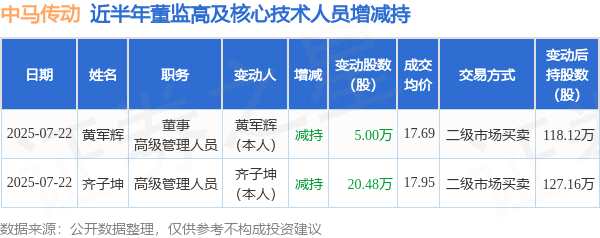 摘要: 消息,根據(jù)7月23日市場公開信息、上市公司公告及交易所披露數(shù)據(jù)整理,中馬傳動(603767)最新董監(jiān)高及相關(guān)人員股份變動情況:2025年7月22日公司董事,高級管理人員黃軍輝、高級管理人員齊子坤共減持
