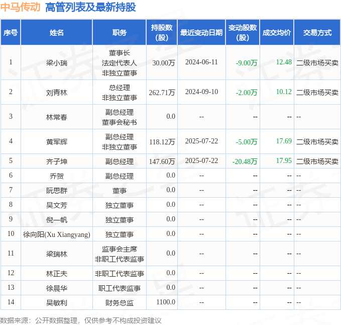 中馬傳動的高管列表及最新持股情況如下: