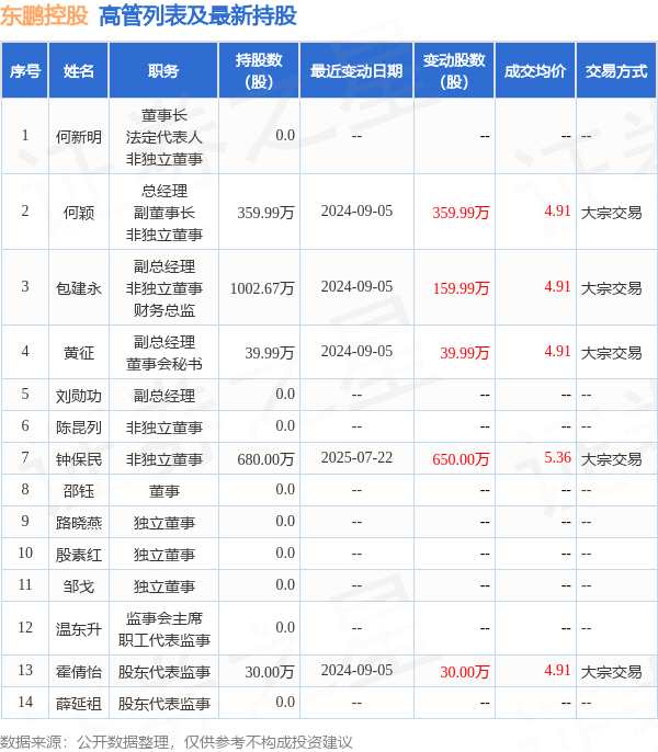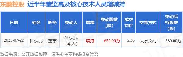 摘要: 消息,根據(jù)7月23日市場公開信息、上市公司公告及交易所披露數(shù)據(jù)整理,東鵬控股(003012)最新董監(jiān)高及相關(guān)人員股份變動(dòng)情況:2025年7月22日公司董事鐘保民共增持公司股份650.0萬股,