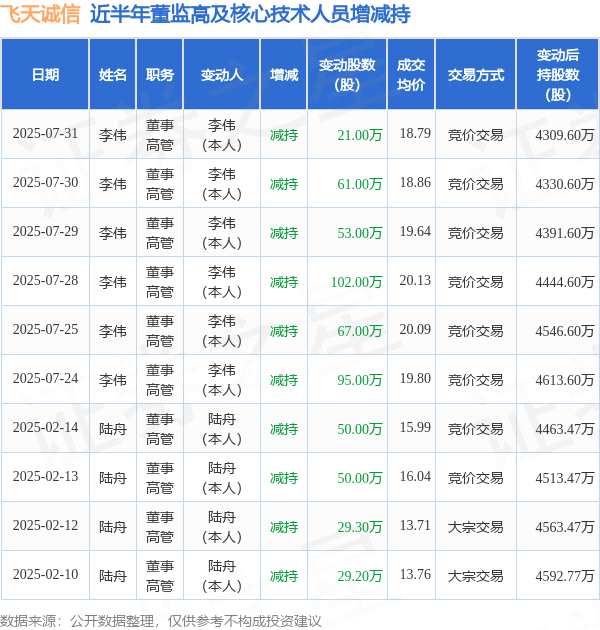 摘要: 消息,根據(jù)8月1日市場(chǎng)公開信息、上市公司公告及交易所披露數(shù)據(jù)整理,飛天誠(chéng)信(300386)最新董監(jiān)高及相關(guān)人員股份變動(dòng)情況:2025年7月31日公司董事,高管李偉共減持公司股份21.0萬(wàn)股,