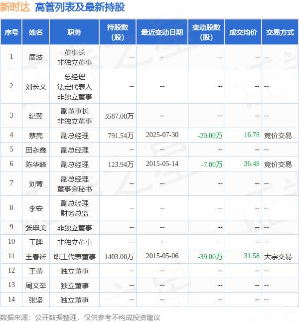 新時達的高管列表及最新持股情況如下: