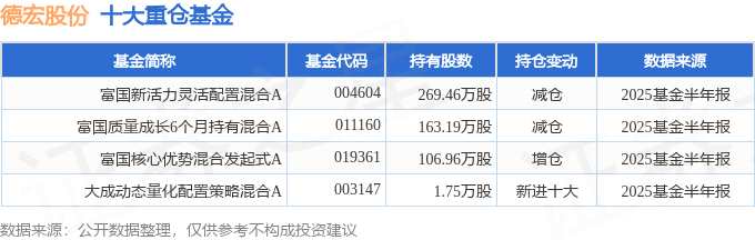 持有德宏股份最多的基金為富國新活力靈活配置混合A,目前規(guī)模為3.79億元,最新凈值3.161(8月8日),較上一交易日上漲0.54%,近一年上漲60.5%。該基金現(xiàn)任基金經(jīng)理為吳棟棟。