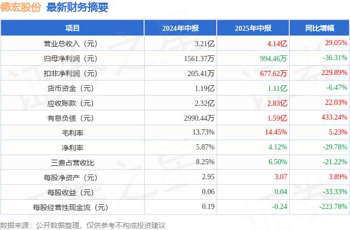 摘要: 據(jù)公開數(shù)據(jù)整理,近期德宏股份(603701)發(fā)布2025年中報(bào)。截至本報(bào)告期末,公司營業(yè)總收入4.14億元,同比上升29.05%,歸母凈利潤994.46萬元,同比下降36.31%。