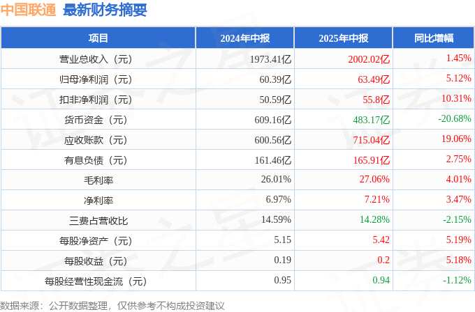 中國聯(lián)通(600050)2025年中報簡析:營收凈利潤同比雙雙增長,盈利能力…