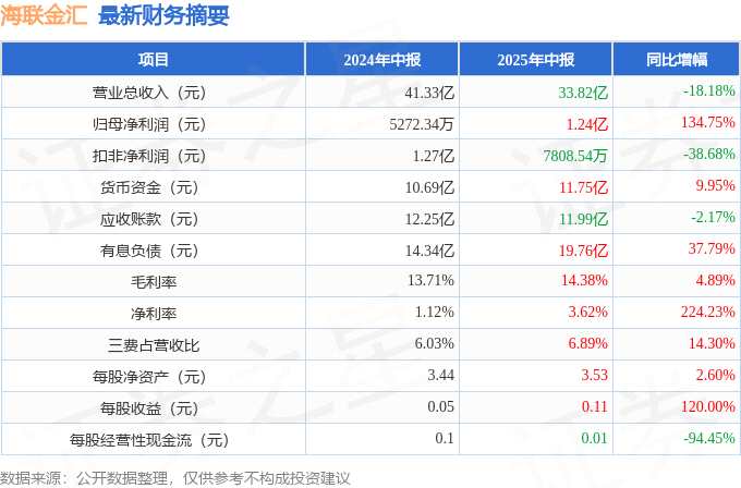 摘要: 據(jù)公開數(shù)據(jù)整理,近期海聯(lián)金匯(002537)發(fā)布2025年中報。截至本報告期末,公司營業(yè)總收入33.82億元,同比下降18.18%,歸母凈利潤1.24億元,同比上升134.75%。
