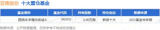 持有亞香股份最多的基金為圓信永豐強(qiáng)化收益A,目前規(guī)模為5.02億元,最新凈值1.1896(8月27日),較上一交易日下跌0.51%,近一年上漲10.68%。該基金現(xiàn)任基金經(jīng)理為林錚。