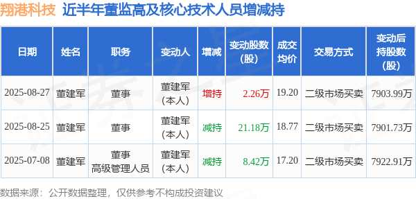 摘要: 消息,根據(jù)8月28日市場(chǎng)公開(kāi)信息、上市公司公告及交易所披露數(shù)據(jù)整理,翔港科技(603499)最新董監(jiān)高及相關(guān)人員股份變動(dòng)情況:2025年8月27日公司董事董建軍共增持公司股份2.26萬(wàn)股,