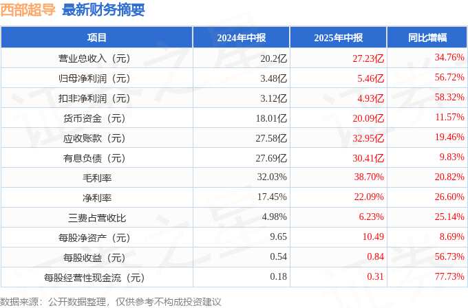 摘要: 據(jù)公開數(shù)據(jù)整理,近期西部超導(dǎo)(688122)發(fā)布2025年中報。截至本報告期末,公司營業(yè)總收入27.23億元,同比上升34.76%,歸母凈利潤5.46億元,同比上升56.72%。