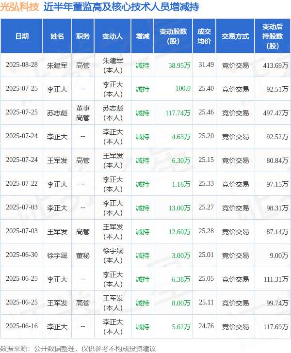 摘要: 消息,根據(jù)8月29日市場公開信息、上市公司公告及交易所披露數(shù)據(jù)整理,光弘科技(300735)最新董監(jiān)高及相關(guān)人員股份變動情況:2025年8月28日公司高管朱建軍共減持公司股份38.95萬股,
