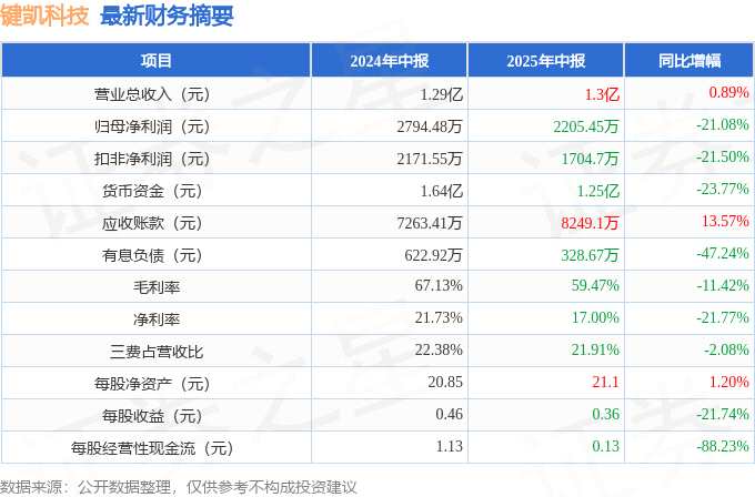 摘要: 據(jù)公開數(shù)據(jù)整理,近期鍵凱科技(688356)發(fā)布2025年中報(bào)。根據(jù)財(cái)報(bào)顯示,鍵凱科技增收不增利。截至本報(bào)告期末,公司營(yíng)業(yè)總收入1.3億元,同比上升0.89%,歸母凈利潤(rùn)2205.45萬(wàn)元,