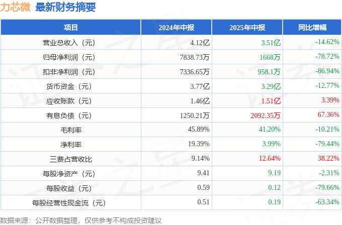 力芯微(688601)2025年中報(bào)簡析:凈利潤同比下降78.72%,三費(fèi)占…