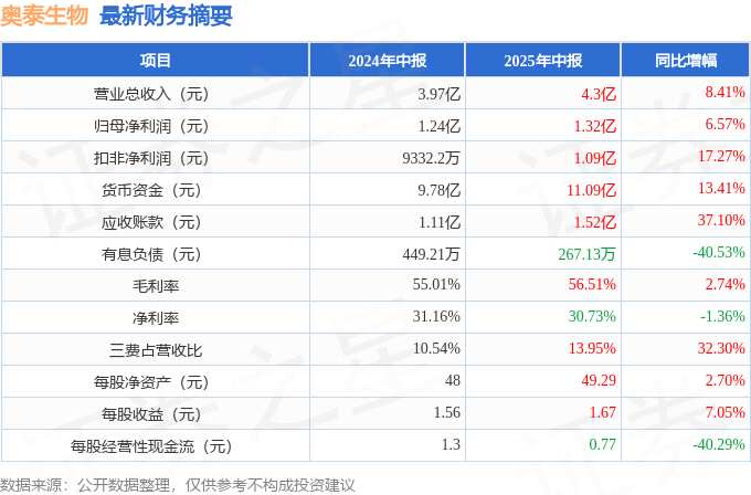 摘要: 據(jù)公開(kāi)數(shù)據(jù)整理,近期奧泰生物(688606)發(fā)布2025年中報(bào)。截至本報(bào)告期末,公司營(yíng)業(yè)總收入4.3億元,同比上升8.41%,歸母凈利潤(rùn)1.32億元,同比上升6.57%。