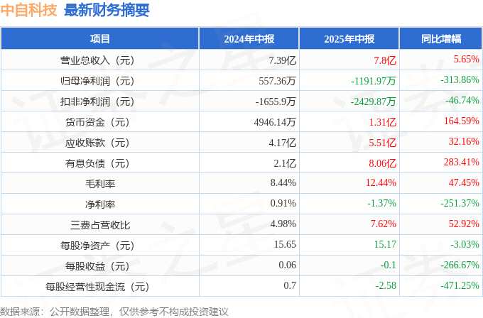摘要: 據(jù)公開數(shù)據(jù)整理,近期中自科技(688737)發(fā)布2025年中報(bào)。根據(jù)財(cái)報(bào)顯示,中自科技增收不增利。截至本報(bào)告期末,公司營(yíng)業(yè)總收入7.8億元,同比上升5.65%,歸母凈利潤(rùn)-1191.97萬元,
