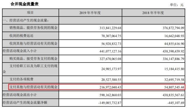 同時(shí),上半年公司經(jīng)營性現(xiàn)金流量凈額虧空放大了333.94倍,由去年同期的-44.51萬元陡然上升至-1.49億元。公司解釋原因是,上半年“支付其它與經(jīng)營活動(dòng)有關(guān)的現(xiàn)金”增加所致。