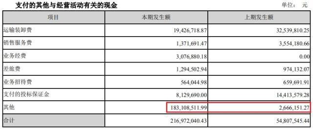 依據(jù)財(cái)報(bào)合并現(xiàn)金流量表,“支付其它與經(jīng)營活動(dòng)有關(guān)的現(xiàn)金”是同比變化最大一項(xiàng),同比增加了1.62億元,增幅為2.96倍。