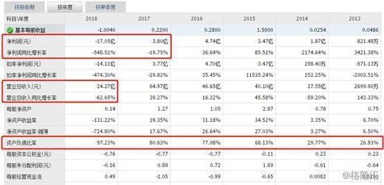 而時間來到2018年之時,公司經(jīng)營業(yè)績更是發(fā)生了翻天覆地的變化。據(jù)年報顯示,2018年全年公司實現(xiàn)營收24.27億元,同比減少62.65%;實現(xiàn)歸母凈利潤為虧損17.05億元,同比大減548.51%,一年虧掉的比借殼上市以來三年總利潤之和的140%還多;經(jīng)營現(xiàn)金流量凈額同比下滑22.09%至84.06億元。