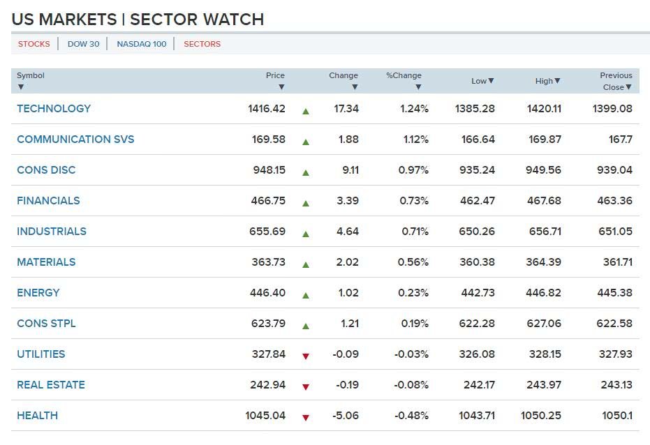 標(biāo)普500指數(shù)11個(gè)板塊中有8個(gè)板塊上漲,3個(gè)板塊下跌。其中,科技和通信系統(tǒng)板塊領(lǐng)漲,健康板塊領(lǐng)跌。