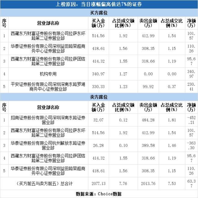 買(mǎi)二、賣(mài)五均為華泰證券深圳益田路榮超商務(wù)中心證券營(yíng)業(yè)部,該營(yíng)業(yè)部買(mǎi)入418.61萬(wàn)元,賣(mài)出308.35萬(wàn)元,凈買(mǎi)額為110.26萬(wàn)元。近三個(gè)月內(nèi)該席位共上榜168次,實(shí)力排名第8。華泰證券深圳益田路榮超商務(wù)中心證券營(yíng)業(yè)部今日還參與了銀寶山新(凈買(mǎi)額-443.74萬(wàn)元)。