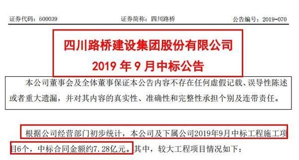 四川路橋前三季度中標(biāo)約197億 本次中標(biāo)約7.28億元