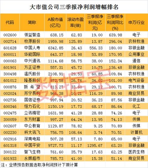證券時(shí)報(bào).數(shù)據(jù)寶統(tǒng)計(jì)顯示,當(dāng)前A股市值超過500億元的上市公司中,已有近50家披露三季報(bào)業(yè)績(jī)數(shù)據(jù)。按照三季報(bào)及預(yù)告凈利潤(rùn)下限計(jì)算,這些公司全部為盈利狀態(tài),且九成以上同比增長(zhǎng)。8家大市值公司凈利潤(rùn)同比增幅將翻倍,分別是領(lǐng)益智造、牧原股份、中國(guó)人壽(601628)、【華能國(guó)際(600011)、股吧】(600011)、中興通訊(000063)、方正證券(601901)、溫氏股份(300498)、隆基股份(601012)。