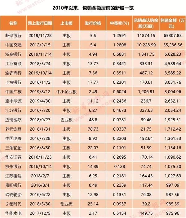 郵儲銀行承銷商的包銷金額也創(chuàng)下2010年最高紀錄,甚至超過【中國交建(601800)、股吧】。資料顯示,中國交建A股于2012年2月發(fā)行,彼時承銷商包銷了超過1億股,包銷金額達5.52億元。