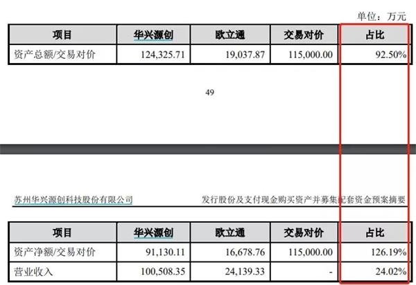 本次交易作價11.5億元,分別占到華興源創(chuàng)資產總額12.43億元、資產凈額9.11億元的91.5%、126.19%。歐立通最近一年營業(yè)收入2.4億元,則占到上市公司10.05億元的24%。