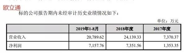 歐立通2017年、2018年、2019年1-8月營業(yè)收入分別為7370萬元、24139萬元、20790萬元,凈利潤分別為1353萬元、7352萬元、7158萬元。