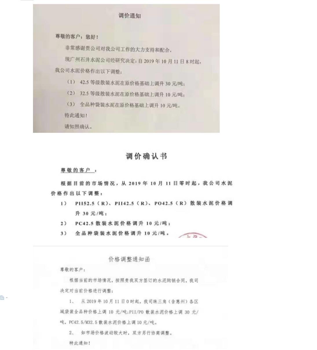 劉生介紹,目前的價格是10月后多家水泥企業(yè)聯(lián)合調(diào)價后的結(jié)果。他向記者展示了水泥企業(yè)發(fā)來的調(diào)價函,珠江水泥、石井水泥、潤豐水泥、鴻豐水泥、中建材水泥5家水泥廠同時在10月10日宣布調(diào)價,散裝水泥中,425型號水泥大多上調(diào)30元/噸,325型號水泥上調(diào)10元/噸,全品種袋裝水泥上調(diào)10元/噸。