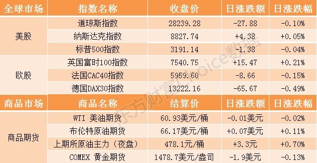 美國(guó)市場(chǎng):美東時(shí)間周三,美股收盤(pán)漲跌不一,道指小幅收跌,納指連續(xù)第6個(gè)交易日上漲,再創(chuàng)收盤(pán)新高。截至收盤(pán),道指下跌27.88點(diǎn),跌幅為0.1%,報(bào)28239.28點(diǎn);標(biāo)普500指數(shù)跌1.38點(diǎn),跌幅為0.04%,報(bào)3191.14點(diǎn);納指漲4.38點(diǎn),漲幅為0.05%,報(bào)8827.74點(diǎn)。特斯拉股價(jià)創(chuàng)新高,市值超700億美元大關(guān);聯(lián)邦快遞股價(jià)重挫逾10%。消息面上,美國(guó)眾議院周三將表決針對(duì)特朗普的彈劾條款。