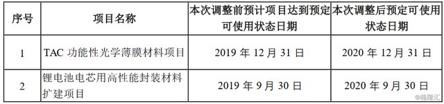 鋰電池電芯用高性能封裝材料擴建項目轉(zhuǎn)募投項目原計劃投資金額7億人民幣,募集資金變更金額5億人民幣,現(xiàn)已使用募集資金4.89億,項目未完成部分屬于承諾用自有資金投資的部分?,F(xiàn)由于新能源項目變化較大,終端客戶產(chǎn)能釋放不及預期,現(xiàn)有產(chǎn)能可以滿足客戶需求,為避免產(chǎn)能過剩,控制資金風險,因此,經(jīng)第五屆董事會第四次會議審議通過,鋰電池電芯用高性能封裝材料擴建項目暨第二條產(chǎn)線將延期投產(chǎn),預計將于2020年9月30日前投產(chǎn)。