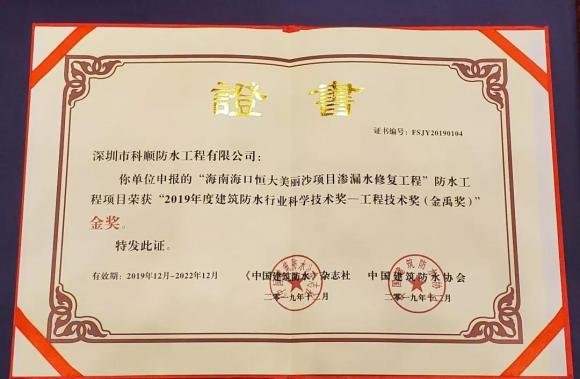 本次會議中,科順股份獲得金禹獎金獎、銀獎,2019年度建筑防水行業(yè)科學(xué)技術(shù)獎,“走進(jìn)社區(qū) 診治滲漏”公益獎,先進(jìn)會員企業(yè)獎,職業(yè)技能大賽優(yōu)勝獎等多項表彰,展現(xiàn)了科順股份在研發(fā)及應(yīng)用技術(shù)、系統(tǒng)服務(wù)、履行會員及社會責(zé)任等多方面的領(lǐng)先優(yōu)勢。作為防水行業(yè)的佼佼者,科順股份始終堅持“技術(shù)科順、誠信科順、服務(wù)科順”的理念,不斷強化技術(shù)優(yōu)勢,提升系統(tǒng)服務(wù)能力。2018年,科順股份順利A股上市,以自身優(yōu)勢資源為基礎(chǔ),借助資本翅膀,科順股份獲得更快速的發(fā)展。建立企業(yè)院士工作站、成立聯(lián)合實驗室擴大研發(fā)優(yōu)勢,設(shè)立全新子公司進(jìn)一步擴大業(yè)務(wù)范圍及服務(wù)能力,全國生產(chǎn)布局提升產(chǎn)能供應(yīng)能力,這些舉措,都讓科順企業(yè)實力及影響力獲得進(jìn)一步提升。在保持企業(yè)穩(wěn)健、快速發(fā)展的同時,科順股份積極踐行社會責(zé)任,踐行國家精準(zhǔn)扶貧,響應(yīng)協(xié)會“走進(jìn)社區(qū) 診治滲漏”公益活動,為社會和諧發(fā)展貢獻(xiàn)力量。