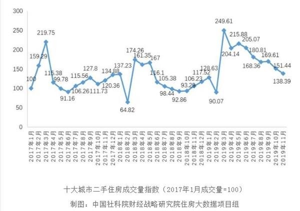2、二手房成交量繼續(xù)回落至近三年平均值附近,成交量有所萎縮但并未降至冰點。2019年11月,10大重點城市二手住房成交量指數(shù)為138.39,比10月下降了8.62%,與2017年以來的二手房成交量指數(shù)月度平均值大體相等。