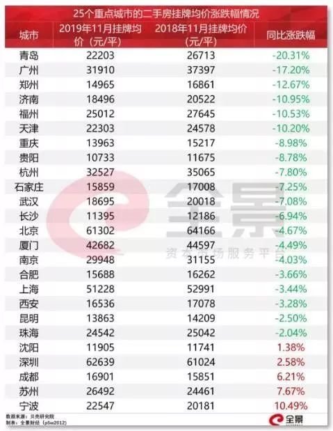 全景財經(jīng)引用貝殼研究院的數(shù)據(jù)顯示,與去年相比,全國多個城市二手房掛牌均價下跌幅度較為明顯。過去一年(2018年11月到2019年11月),25個重點城市有20個城市的掛牌均價出現(xiàn)下跌,甚至有城市的跌幅超過20%。