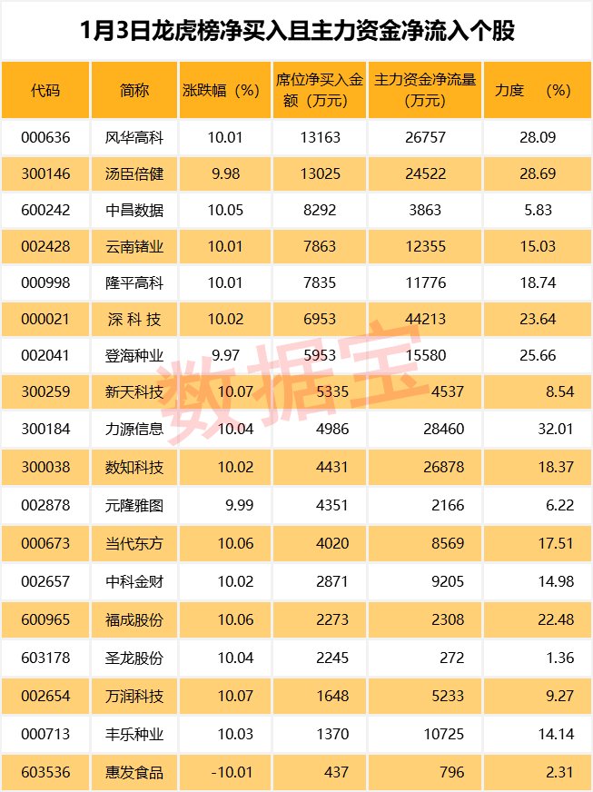 1月3日龍虎榜中機(jī)構(gòu)及營(yíng)業(yè)部席位資金凈買入4.74億元,其中凈買入的個(gè)股有20只;凈賣出的個(gè)股有18只。凈買入前三名個(gè)股分別是風(fēng)華高科、湯臣倍健、【中昌數(shù)據(jù)(600242)、股吧】等,凈買入金額占當(dāng)日成交額比例達(dá)13.82%、15.24%、12.51%。