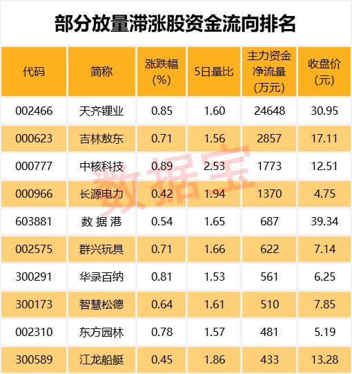 值得注意的是,81只放量滯漲股中,天齊鋰業(yè)、吉林敖東、中核科技、長(zhǎng)源電力、數(shù)據(jù)港等個(gè)股主力資金凈流入較多。